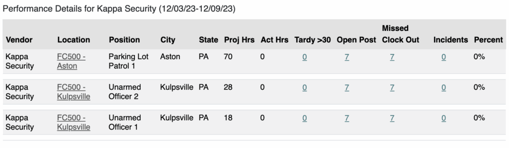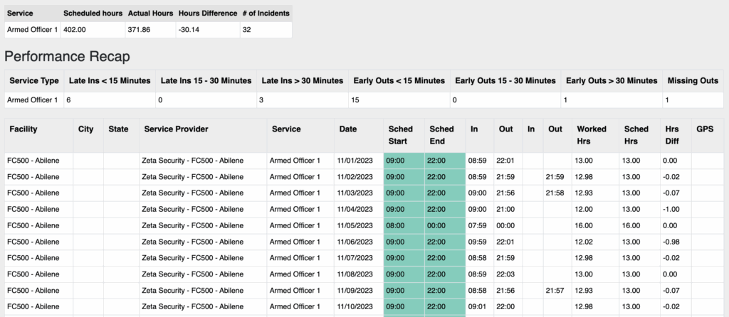 As mentioned earlier, Hours Scheduled is an important metric to track and contribute to vendor KPI reporting, but it is also crucial for maintaining accurate time and attendance records. It is important for your business, your vendors and your security officers to have what hours the security officers are expected to be on and off post clearly defined. This metric provides a real-time understanding of workforce availability, aiding in the prevention of discrepancies and fostering precise management of labor resources.
