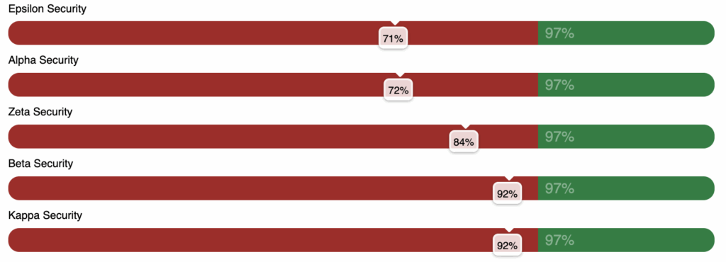 Securitime’s vendor comparison charts offer a clear visual representation of each vendor’s overall performance (using the data analytics shared under Vendor KPIs above) in a unified view. This chart streamlines the evaluation process, breaking down vendor performance into one clear percentage compared to expected benchmarks. This allows your organization to easily compare vendors’ effectiveness in one comprehensive glance, identifying top performers and which vendors have room for improvement.